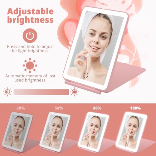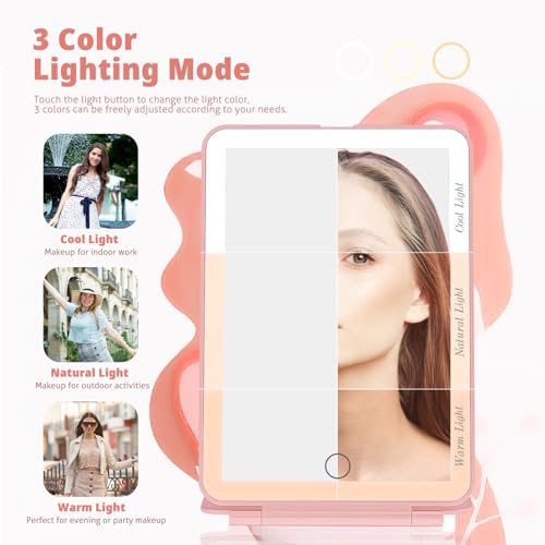 Travel Mirror for Makeup, Rechargeable Light up Pink Mirror with 72 LED Lights,1000mAh Batteries, 3 Colors Light Modes USB Portable Desktop Mirror with Dimmable Touch Screen (Pink)